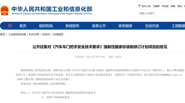 【环球网财经综合报道】5月8日至6月7日,工信部公开征集《汽车车门把手安全技术要求》强制性国家标准制修订计划项目意见,拟规范电动式、隐藏式车门把手多项安全指标。